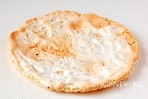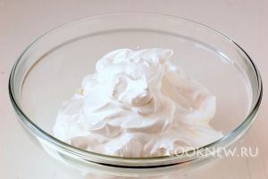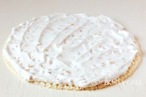 Выложить на первый корж, уложенный белками вверх, 1/3 часть крема. Разровнять