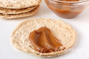 Смазать каждый вафельный корж белково-арахисовой массой. Поставить выпекаться в духовку на 30 минут при 170°С. Так приготовить 4 коржа