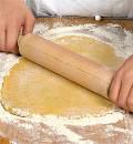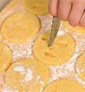 На присыпанной мукой поверхности раскатать тесто в пласт толщиной примерно 3 мм. Вырезать 24 круга диаметром 7,5 см. Выложить их на пергамент.