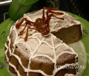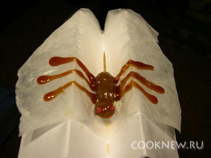 Паучок: туловище вылепить из мякиша этого кекса, обмакнуть в карамель. Потом прилепить голову и еще раз обмакнуть