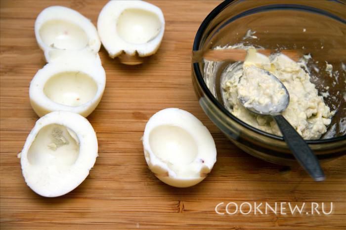 Отварить яйца, остудить и очистить. Разрезать на две половинки и вынуть желток. Желтки смешать с чесноком и майонезом. И этой массой наполнить половинки яиц.
