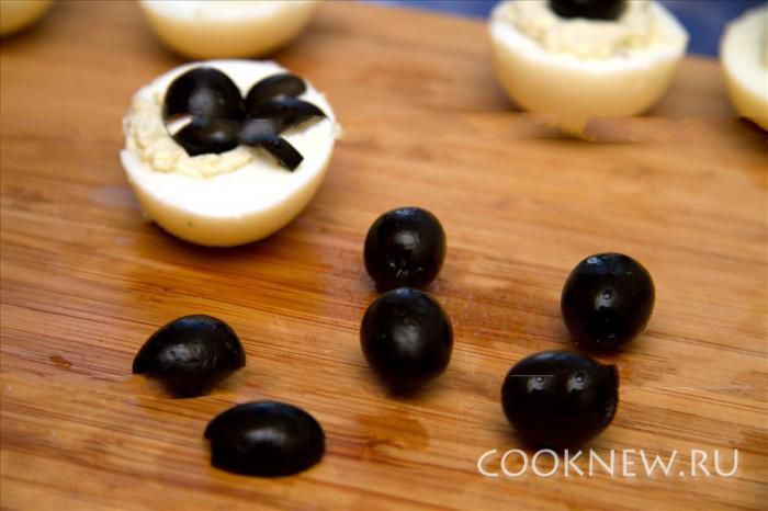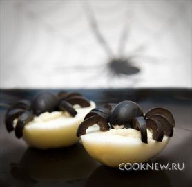 Из оливок сделать пауков. Целые оливки положить в середину яйца - это туловище. Лапки-разрезаем оливку пополам и нарезаем тонкими полосками. Прикладываем лапки к брюшку.