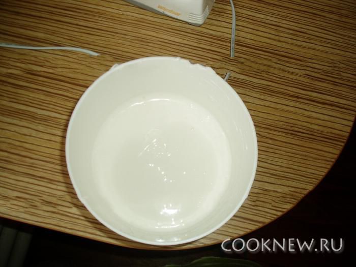 Белки взбить в крепкую пену, постепенно ввести сахар (225 гр), и взбивать до загустения