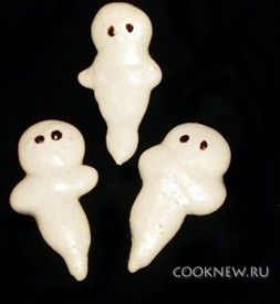 Выложить на противень пергамент, на пергамент ложкой уложить пену в виде привидений. Выпекать при температуре 110 градусов 60 минут, затем выключить духовку и оставить безе еще на 30 минут. Готовым привидениям добавить глазки