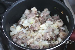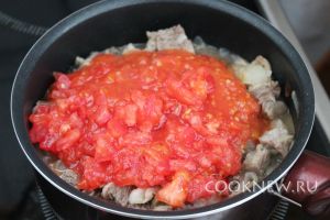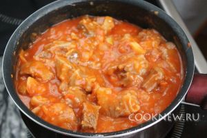 Добавить к мясу, довести до кипения, минут 5 потушить