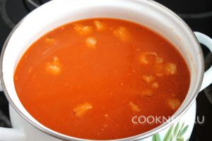 Разогреть процеженный бульон, ввести в него мясо с помидорами и луком