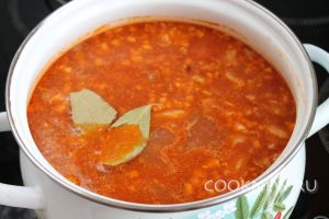 Довести до кипения, ввести толчёный чеснок и орехи, добавить лавровый лист, при медленном кипении подержать несколько минут