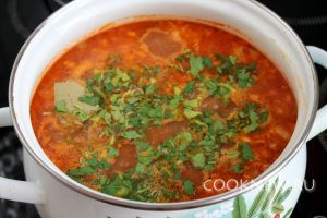 Добавить зелень кинзы и петрушки, дать немного настояться под крышкой.