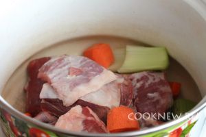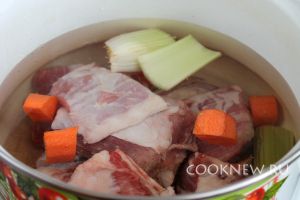 В кастрюлю сложить промытое мясо, крупными кусками нарезанные сельдерей и морковь, четвертинку луковицы