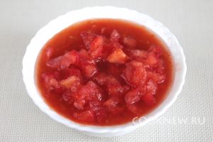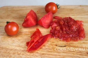 Пока варится мясо, займемся приготовлением суповой заправки. Помидоры ошпарить, очистить от кожицы и мелко нарезать