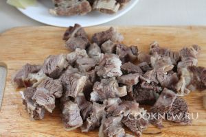 Мясо вынуть из бульона, слегка остудить и мелко нарезать. Бульон процедить, удалив коренья
