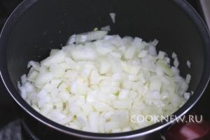 В сотейнике на снятом с бульона жире потушить лук, доводя его до прозрачности