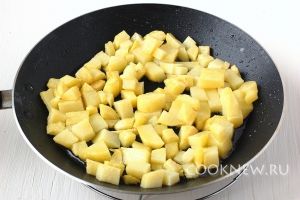 Картофель очистить, нарезать кубиком и обжарить на растительном масле до полуготовности и появления корочки сверху
