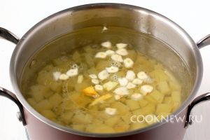 В кастрюлю с кипящей водой бросить подготовленный картофель и порезанный пластинками чеснок. Посолить по вкусу