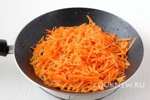 Морковь почистить, натереть на крупной тёрке и потушить на подсолнечном масле 2 минуты