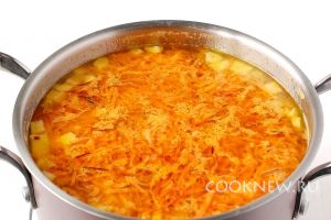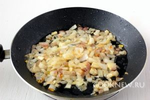 Лук почистить, порезать кубиком и обжарить на растительном масле до полуготовности. Добавить лук в кипящий суп