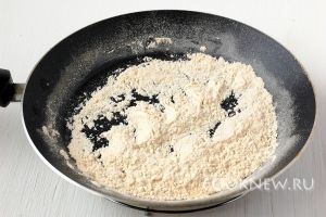 Муку обжарить на среднем огне на сухой сковороде до слегка кремового цвета, постоянно помешивая