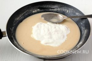 Охладить муку. Добавить 0,5 стакана воды и сметану. Растереть в однородную массу