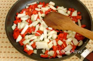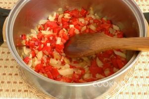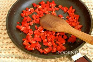 Перец сладкий промыть, почистить от семян и нарезать кубиками. Слегка пассеровать на растительном масле