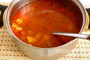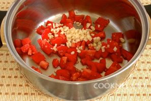 Протушить немного помидоры с чесноком, выложить в кастрюлю лук с перцем, добавить паприку, перемешать. Залить 1 л кипятка, посолить. Довести до кипения.