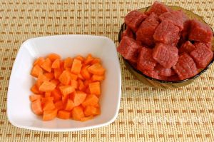 Выложить мясо, нарезанное кубиками 2х2 см. Довести снова до кипения, уменьшить огонь и варить 1 час. Морковь почистить и нарезать небольшими кубиками