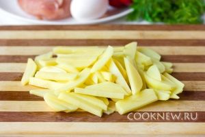 Картофель чистим, нарезаем соломкой. Наливаем в кастрюлю воду, помещаем в неё картофель, ставим на огонь, даём воде закипеть, солим по вкусу и варим на медленном огне