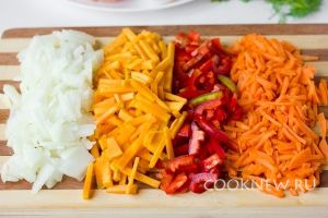 Чистим лук, морковь, тыкву, сладкий перец, нарезаем овощи соломкой.