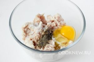 Пока варится картофель и обжариваются овощи — готовим фрикадельки. Куриное филе пропускаем через мелкую сетку мясорубки. Добавляем соль, чёрный молотый перец и вбиваем яйцо. Тщательно перемешиваем