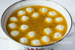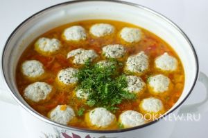 Когда фрикадельки вспылвут и вода закипит — добавляем в суп овощную обжарку. Даём супу закипеть ещё раз и варим на медленном огне под крышкой около 7 мину