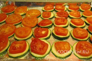 Включить духовку разогреваться до температуры 170 градусов. Противень застелить фольгой, кухонной силиконовой кисточкой смазать фольгу небольшим количеством растительного масла. Поверх фольги выложить кабачки. Присолить и выложить сверху помидоры. Снова посолить, поперчить