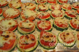 Отправить противень с кабачками минут на 8 в духовку. Сыр за это время полностью расплавится и покроется золотистой корочкой.