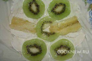 Берем любые фрукты, которые вам нравятся. Например, можно взять бананы, киви и яблоки и мандарины. По желания вы можете к зефиру добавить и ягоды. Например, клубнику и смородину с малиной. Выкладываем на тарелку слоями торт. Сначала укладываем отрезанные нижние части зефира, потом поливаем все смесью сметаны со сгущенкой. Промежутки между зефиром заполняем фруктами и ягодами. Все снова поливаем кремом