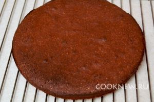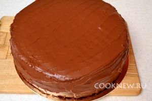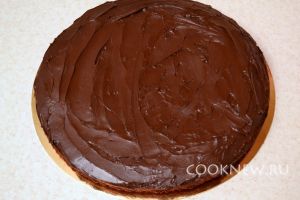 Перемажьте шоколадом оставшиеся два коржа, а также обмажьте его по бокам. Дайте шоколаду застыть в холодильнике и украсьте торт по своему усмотрению
