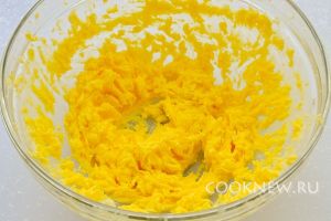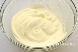 Отдельно взбейте белки со щепоткой соли и 3 ст. л. сахара до крепких пиков
