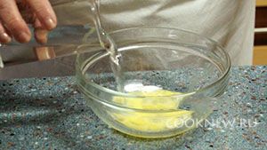 Приготовим тесто для рулетиков. Одно яйцо разбиваем, перемешиваем и делим пополам. Нам понадобится только половина яйца, добавляем к половине яйца половину чайной ложки соли и 100 миллилитров воды.
