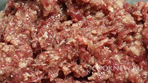 Пропускаем 250 граммов мякоти говядины и одну луковицу через мясорубку с мелкой решёткой. Присаливаем фарш половиной чайной ложкой соли и приперчиваем щепоткой чёрного молотого перца. При необходимости добавляем в фарш воду, для того чтобы фарш не был очень густым.