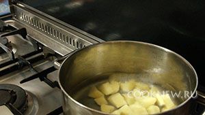 Три картофелины нарезаем крупными кубиками и кладём в кастрюлю с двумя литрами холодной воды. Накрываем крышкой, доводим до кипения и варим на маленьком огне приблизительно 20 минут.