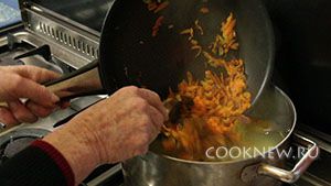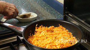 Нарезаем мелкими кубиками одну луковицу и натираем на крупной тёрке одну или две морковки. Подготовленные овощи обжариваем на сковороде с 30 граммами топлёного или сливочного масла.