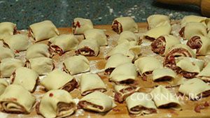 Тесто раскатываем в пласт толщиной не более одного миллиметра. На раскатанное тесто выкладываем ровным слоем подготовленный фарш. Сворачиваем рулетом и нарезаем на рулетики приблизительно по два-три сантиметра.