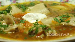 Готовый Бабушкин суп подаём к столу с мелко нарезанной зеленью и со сметаной