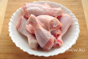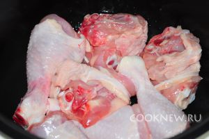 Окорочка промываем под проточной водой, разрезаем пополам, для того чтобы они компактнее разместились одним слоем в мультиварке (используйте не больше трех штук) и солим