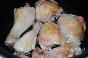 Наливаем масло в чашу мультиварки, включаем режим «жарка» и как только масло разогреется, выкладываем кусочки курицы в один слой