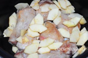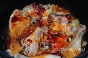 Спустя 20 минут перемешиваем кусочки курицы с яблоком и заливаем смесью кетчупа, горчицы, соевого соуса и мёда