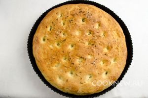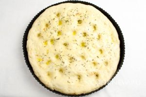 Выпекать фокаччу в горячей духовке при температуре 240 °C в течение 20–25 минут до румяной корочки