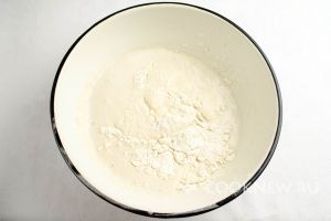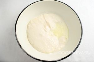 Муку просеять. Частями добавлять к массе муку. Замешивать сначала деревянной ложкой, а потом руками. Удобно выложить тесто на рабочую поверхность. Замешивать двумя руками 10-15 минут