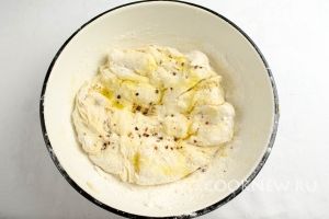 Сформировать из теста шар. Выложить в чистую, смазанную небольшим количеством оливкового масла ёмкость. Накрыть салфеткой. Поставить в тёплое место на 1 час. Включить духовку на 240 °C