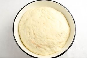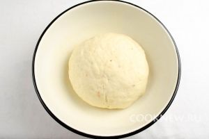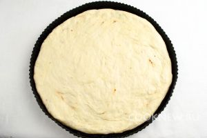 Растянуть тесто в лепёшку толщиной 1,5–2 см, уложить её в подготовленную форму. Накрыть салфеткой. Оставить в тепле ещё на 30 минут.