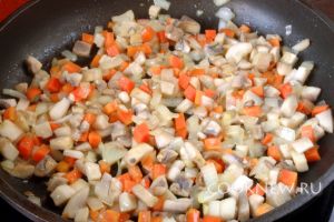 Лук и морковь почистить, мелко нарезать, слегка обжарить на растительном масле. Добавить грибы. Обжарить всё вместе