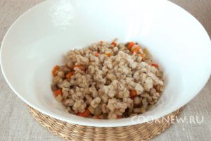 Переложить овощную массу в миску, добавить сваренную перловку