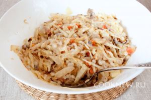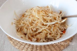 На оставшемся масле слегка обжарить нашинкованную капусту. Добавить капусту в миску